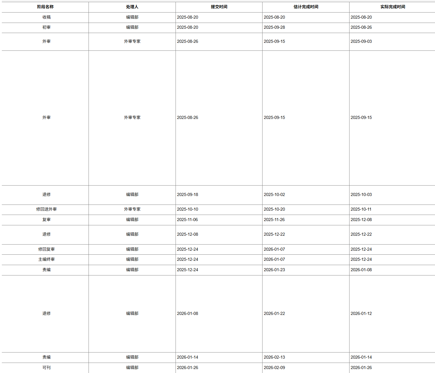 2025年7月底投稿,2026年1月底录用啦。具体的投稿流程见流程图。主要审稿流程如下:初审——外审(两个专家)——复审——退修——修回送外审——复审——退修——修回复审——主编终审——责编——退修(格式修改和字数删减)——责编——可刊。希望大家投稿顺利,2026年多发paper,百发百中!