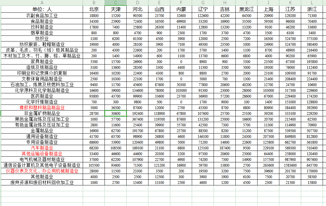 注意:1.数据说明:1.由于各省统计年鉴公布数据不全/缺失,故而本数据采用中国工业统计年鉴数据,以万人为单位,所以数据都为“00”结尾,数据已统一为“人”。