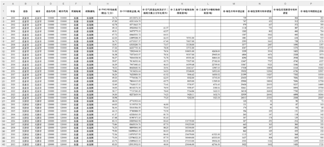 团队根据《中国城市统计年鉴》、各地方统计年鉴、国家知识产权局等筛选并整理出共计29个环境保护、环境规制相关指标数据,包括CO2、PM2.5、绿色专利、碳交易、工业三废排放等