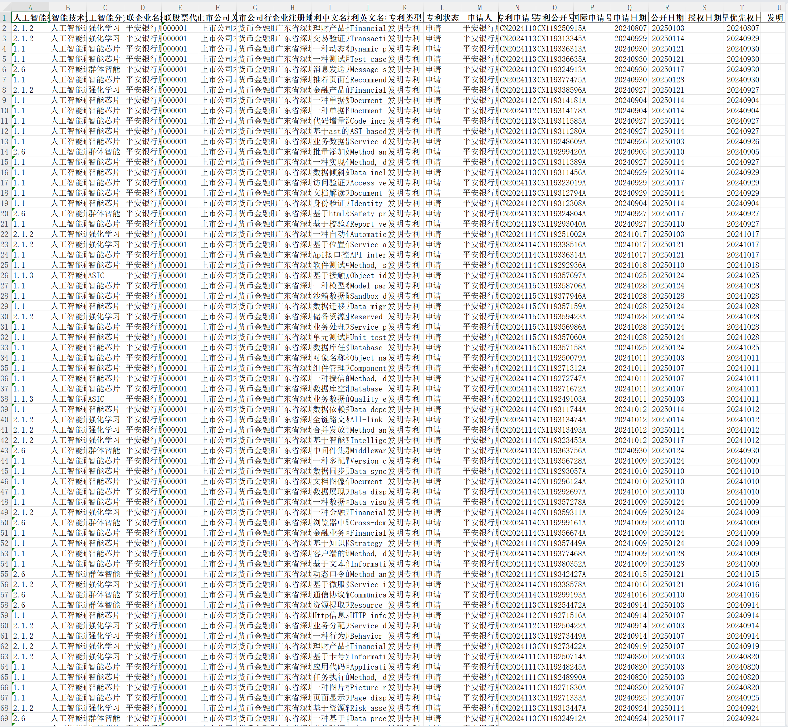 截至2025.1,整理人工智能专利数据155.4万条。包括上市公司本身、子公司、联营、合营公司。含人工智能专利的44个技术分支。包含人工智能编号和分类、与上市公司关系、专利号、专利明细等32项指标