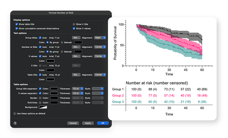 Kaplan-Meier生存曲线图现在会自动生成风险人数表,以便更直观地解读分析结果。