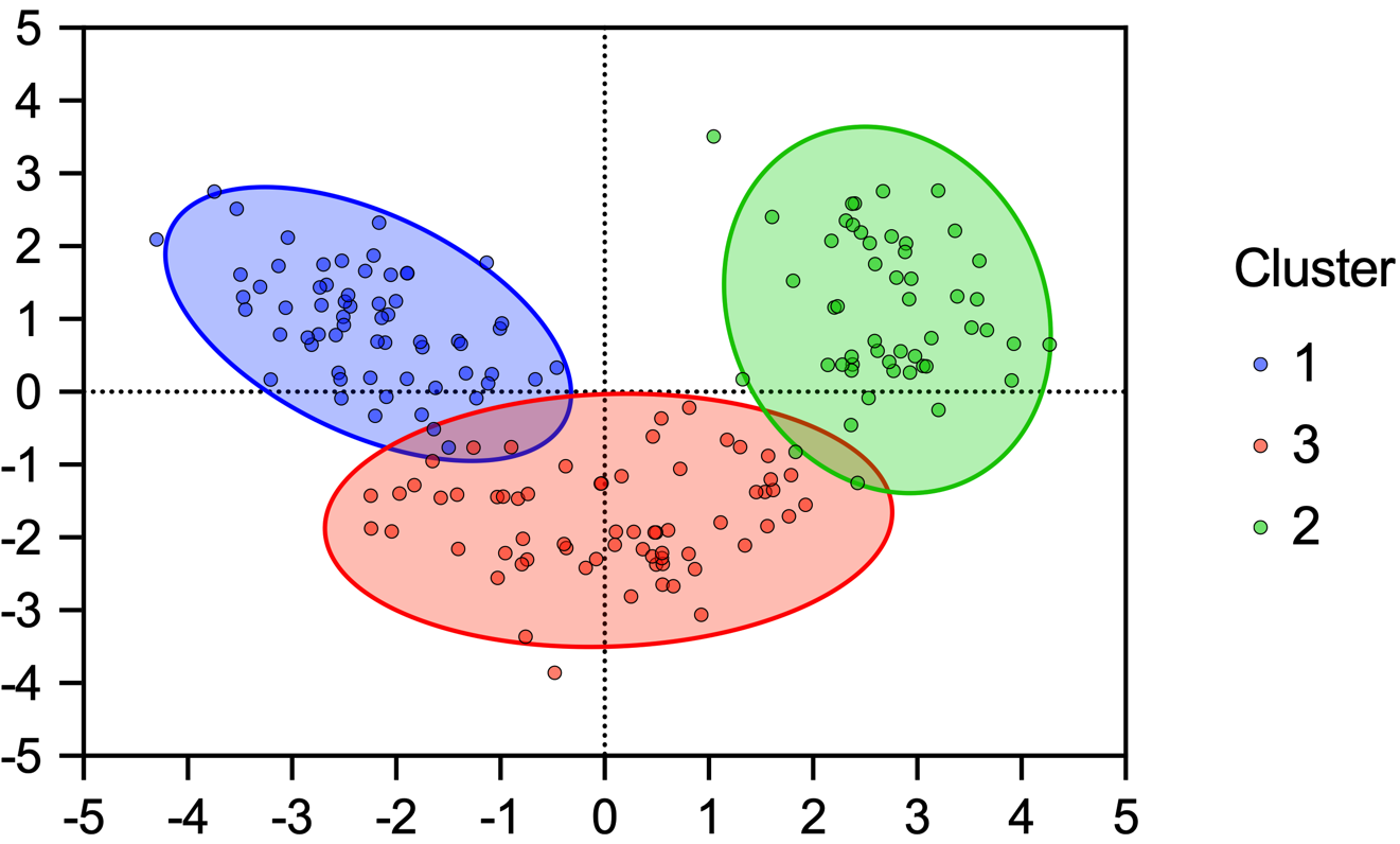这是Prism 10.3版本中与层次聚类一同推出的第二个机器学习算法。您可以指定聚类的具体数量或数量范围来分析数据,Prism会通过迭代方式,为数据中的每个观测值优化其所属的聚类分配。
