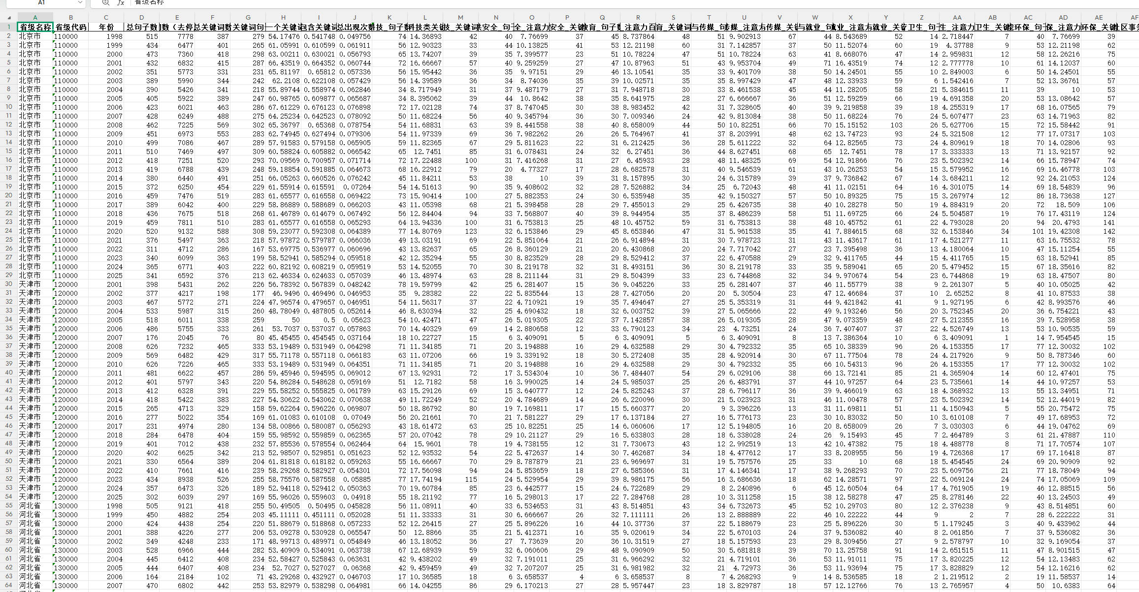 省级名称、省级代码、年份、总句子数、总单词数(去停用词)、总关键词数、