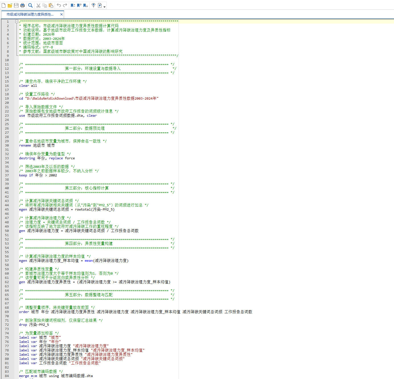 市级减污降碳治理力度异质性数据计算代码.do Stata计算代码