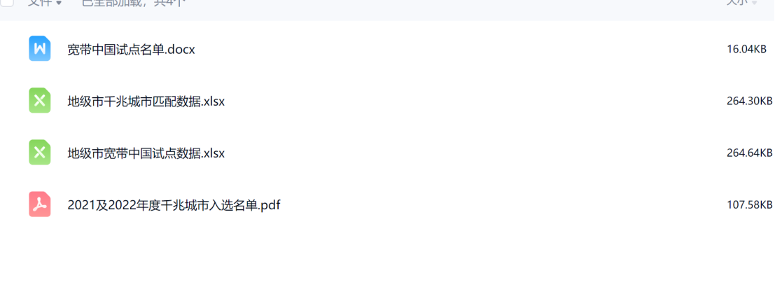 数据格式:包含宽带中国试点Excel;千兆城市匹配Excel;千兆城市入选名单Pdf;宽带中国试点名单Docx