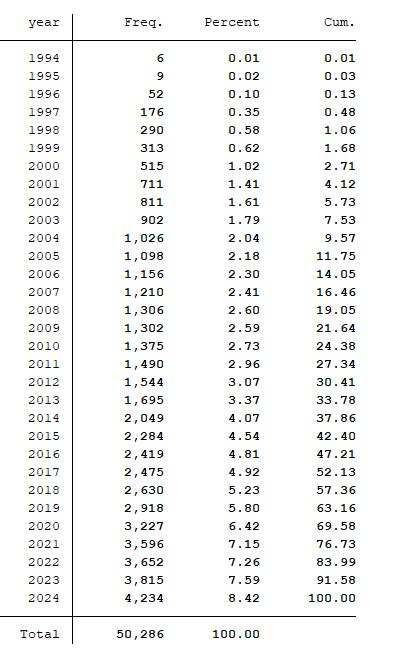 样本选择:全部A股1994-2024年数据(初始数据区间是1990-2024年,经过处理之后的数据区间为1994-2024年)