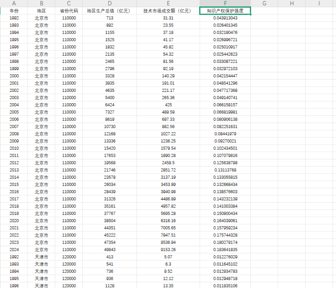 数据名称:1992-2024年省级-知识产权保护强度