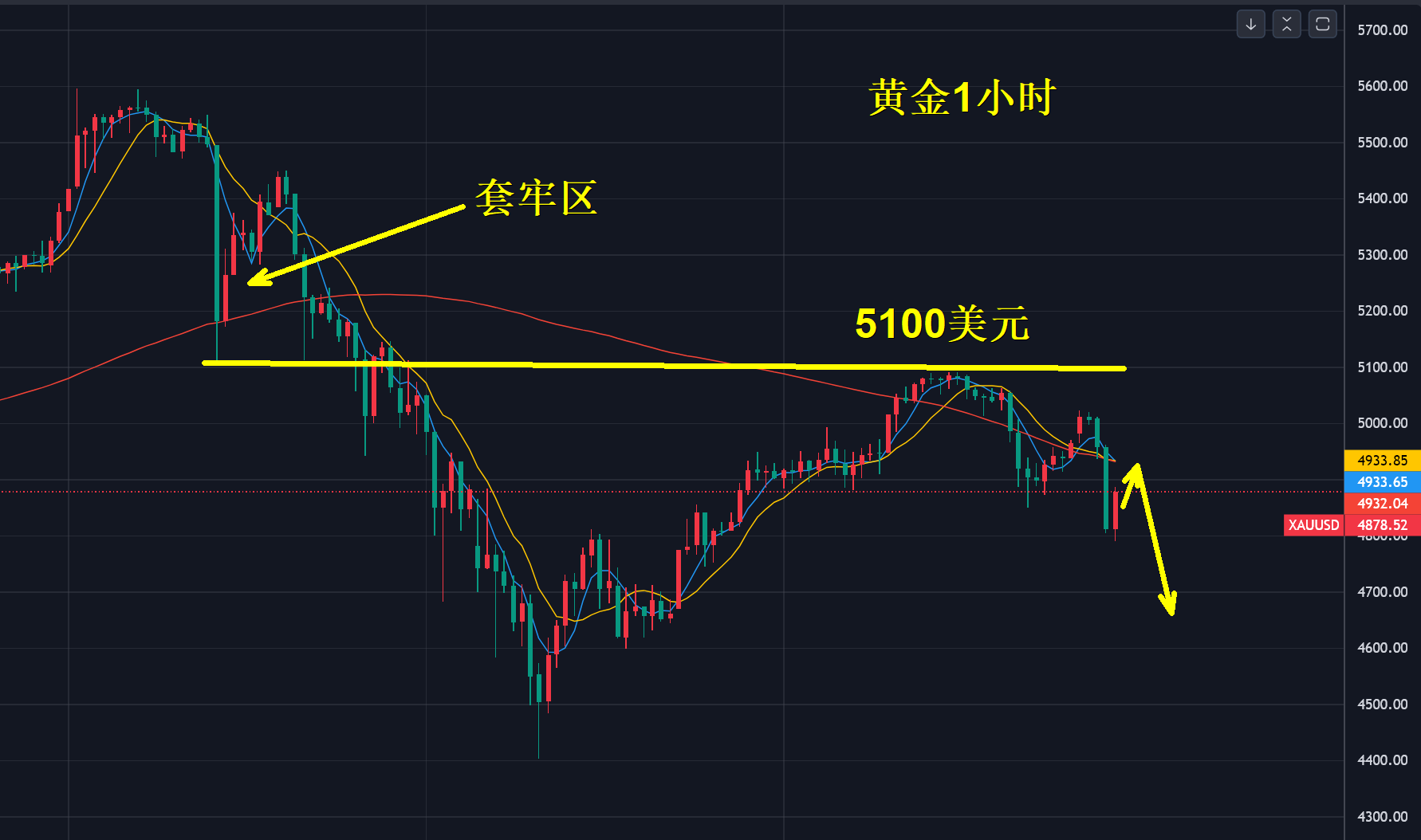 这次黄金反弹刚好卡在5100美元,这不是巧合,上周四从5600美元首次跌下来5100美元是强支撑,后来反弹到5400美元击穿了5100美元的支撑,恰恰因为反弹大量多头选择在5100美元附近入场,后来的下跌被套。