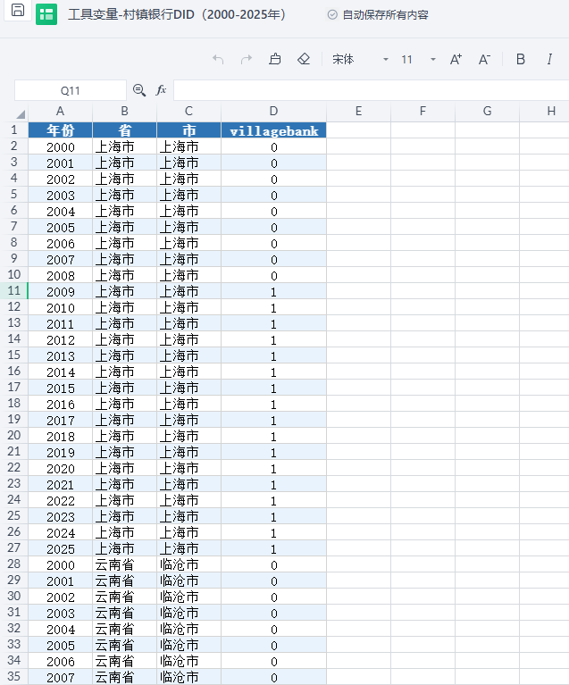 本数据构建过程中,主要参考了杨晨、朱佳、马九杰《小银行发挥优势了吗:村镇银行设立对城乡收入差距的影响研究》文献的研究思路与方法,确保数据的科学性与适用性。数据以2000-2025年全国各城市为样本范围,核心构建虚拟变量“villagebank”,表示城市当年是否设立村镇银行,具体规则以各城市第一家村镇银行最早批准日期为判断标准:批准年份及后续年份取值为1,批准之前的年份取值为0;未批准设立村镇银行的城市,全样本期取值均为0,数据涵盖年份、省份、地级市、设立状态等核心指标,为相关实证研究提供标准化、可操作的量化依据。