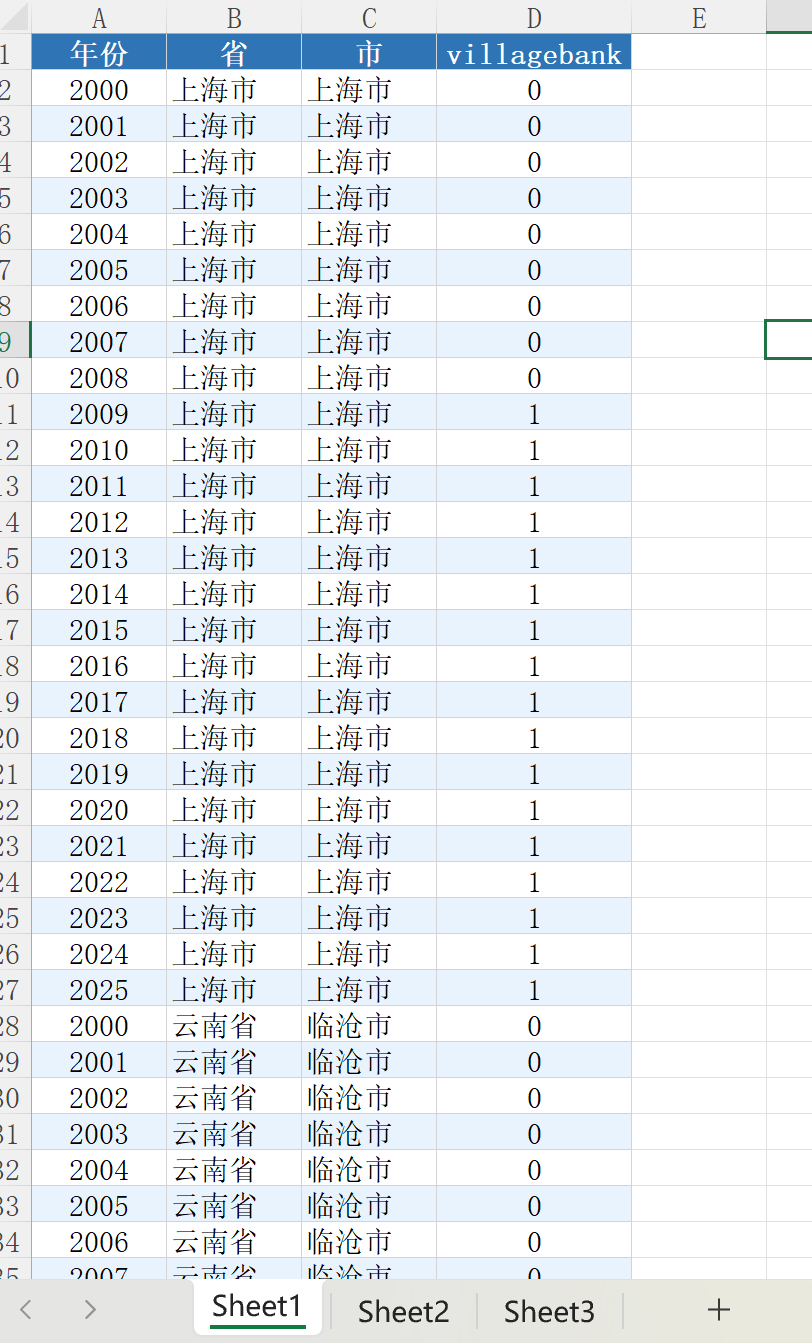 各地级市村镇银行设立DID数据00-25年金融服务发展水平数据数据可以做以下研究:1.村镇银行对农村金融普惠性的影响:利用DID模型评估村镇银行设立对农村地区金融服务覆盖率、贷款可得性的提升作用,分析其对缓解城乡金融供给不平衡的效果。2.村镇银行与县域经济增长的关联:通过DID分析村镇银行设立对县域GDP、农民收入、农业产值等指标的净效应,探究其作为农村金融增量改革载体对县域经济的驱动机制。3.村镇银行与农民合作社协同发展:结合村镇银行设立数据与农民合作社成立数据,用DID模型研究村镇银行对合作社融资支持、规模扩张的作用,验证农村金融与农业组织化的互动关系。