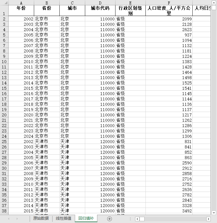 excel数据文件包原始数据(由于多年度指标不同存在缺失值)、线性插值、回归填补三个版本,提供您参考使用。
