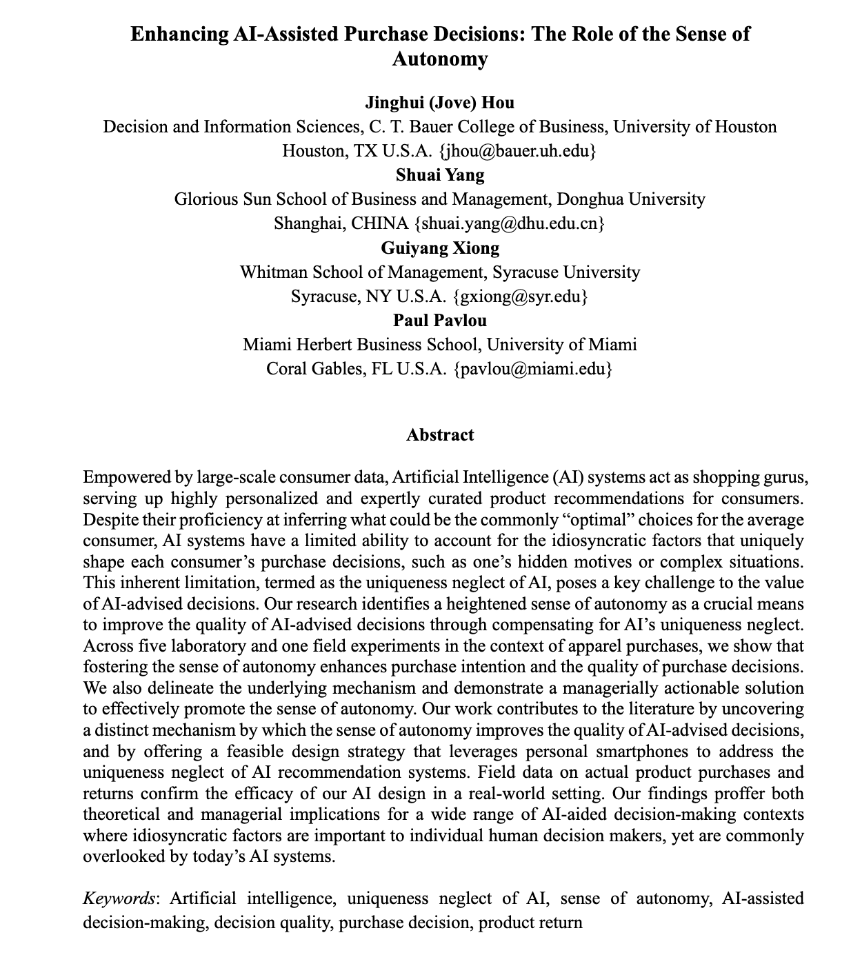 【文题(必填)】 Enhancing AI-Assisted Purchase Decisions: The Role of the Sense of Autonomy. MIS Quarterly. Forthcoming.