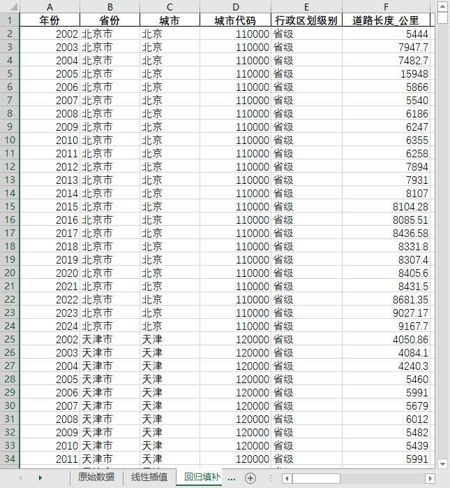 excel数据文件包原始数据(由于多年度指标不同存在缺失值)、线性插值、回归填补三个版本,提供您参考使用。