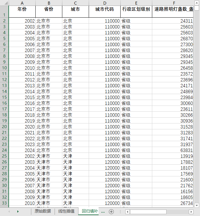 全国680多个地级市县级市2002-2024城市道路和桥梁照明灯盏数安装路灯道路长度含原始数据无缺失值填补含省级汇总