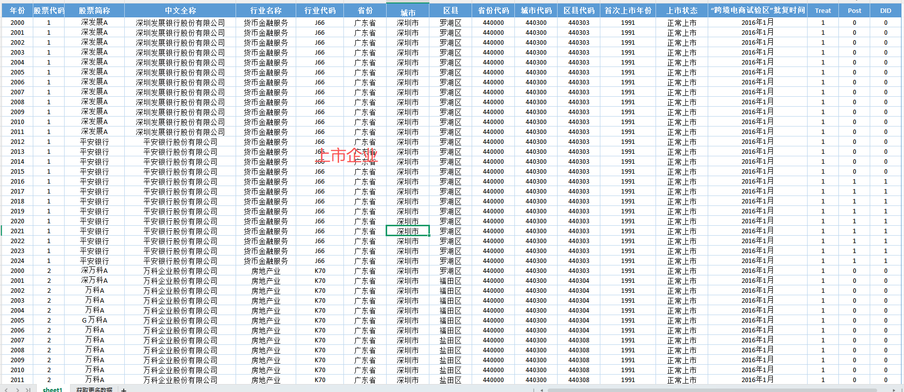 年份、股票代码、股票简称、中文全称、行业名称、行业代码、省份、城市、区县、省份代码、城市代码、区县代码、首次上市年份、上市状态、“跨境电商试验区”批复时间、Treat、Post、DID