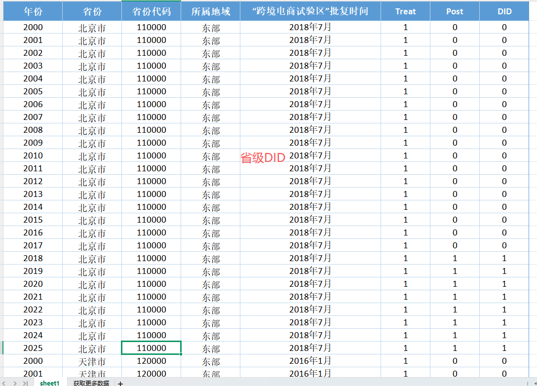 年份、省份、省份代码、所属地域、“跨境电商试验区”批复时间、Treat、Post、DID