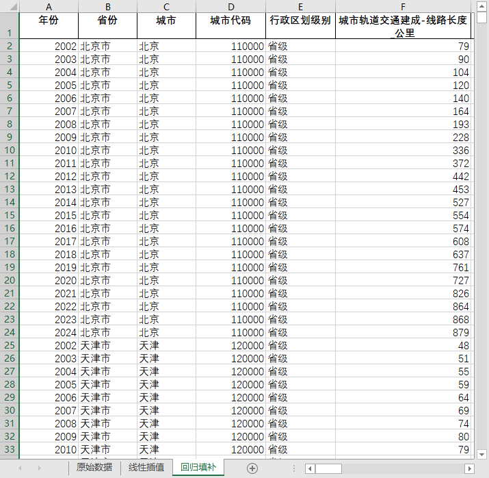 全国680多个地级市县级市2002-2024地铁轻轨单轨有轨磁浮城市轨道交通建成线路长度含原始数据无缺失值填补含省级汇总