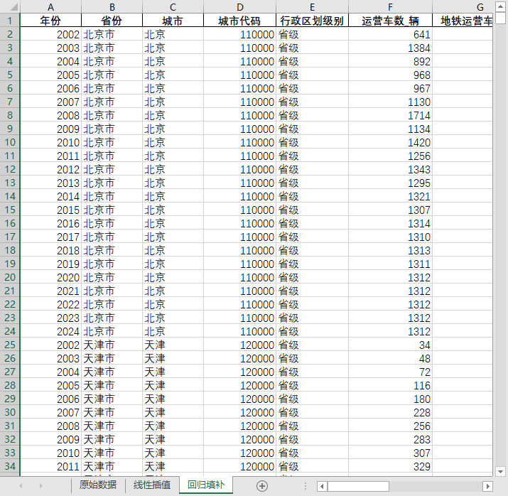 全国680多个地级市县级市2002-2024地铁轻轨有轨电车标准运营车数含原始数据无缺失值填补含省级汇总