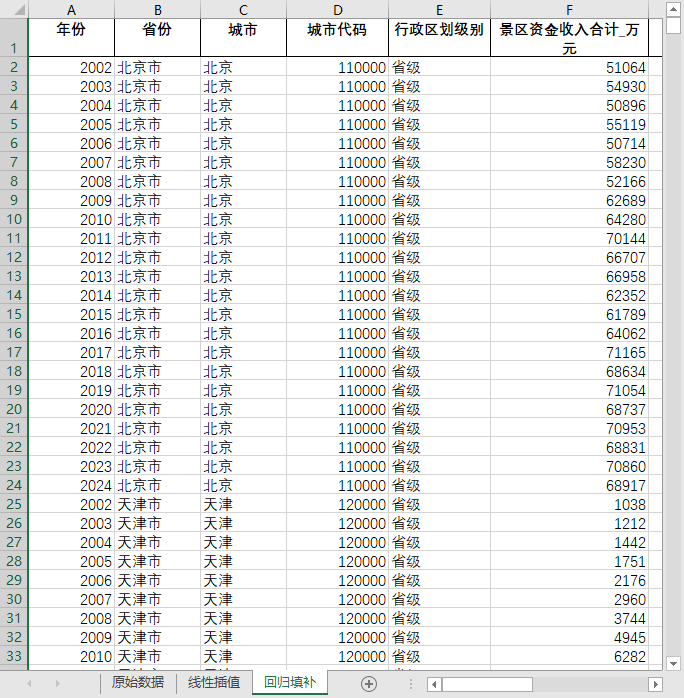 全国680多个地级市县级市2002-2024风景名胜区景区资金收入国家拨款经营收入门票收入含原始数据无缺失值填补含省级汇总
