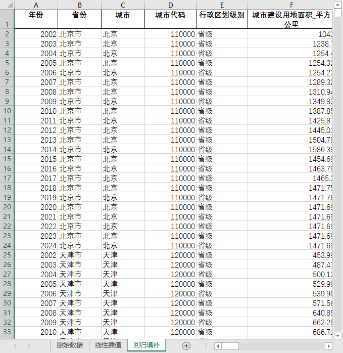 excel数据文件包原始数据(由于多年度指标不同存在缺失值)、线性插值、回归填补三个版本,提供您参考使用。
