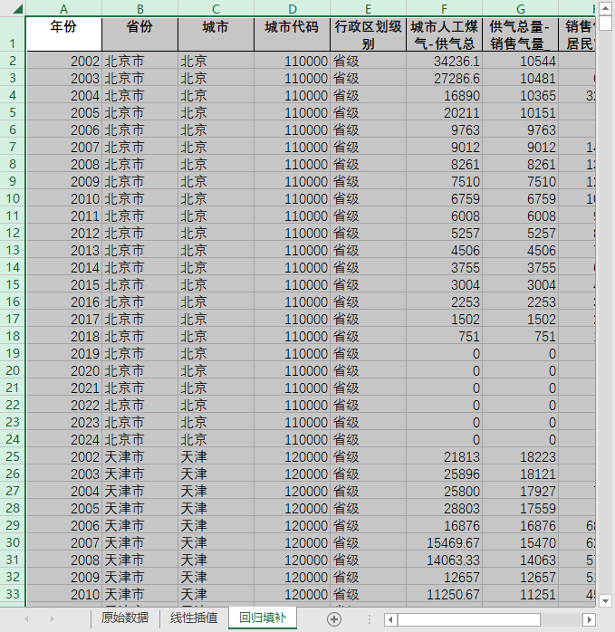 全国680多个地级市县级市2002-2024人工煤气供气总量居民家庭销售气量燃气损失量含原始数据无缺失值填补含省级汇总