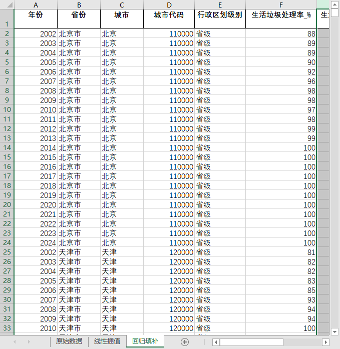 全国680多个地级市县级市2002-2024生活垃圾处理率无害化处理率含原始数据无缺失值填补含省级汇总