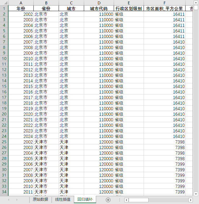 excel数据文件包原始数据(由于多年度指标不同存在缺失值)、线性插值、回归填补三个版本,提供您参考使用。