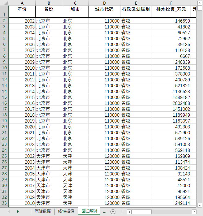 全国680多个地级市县级市2002-2024市政排水污水处理及其再生利用固定资产投资含原始数据无缺失值填补含省级汇总
