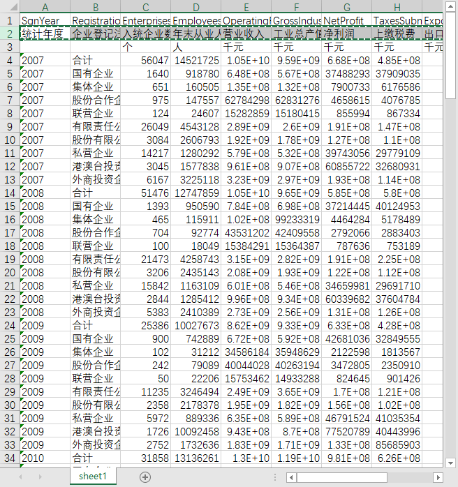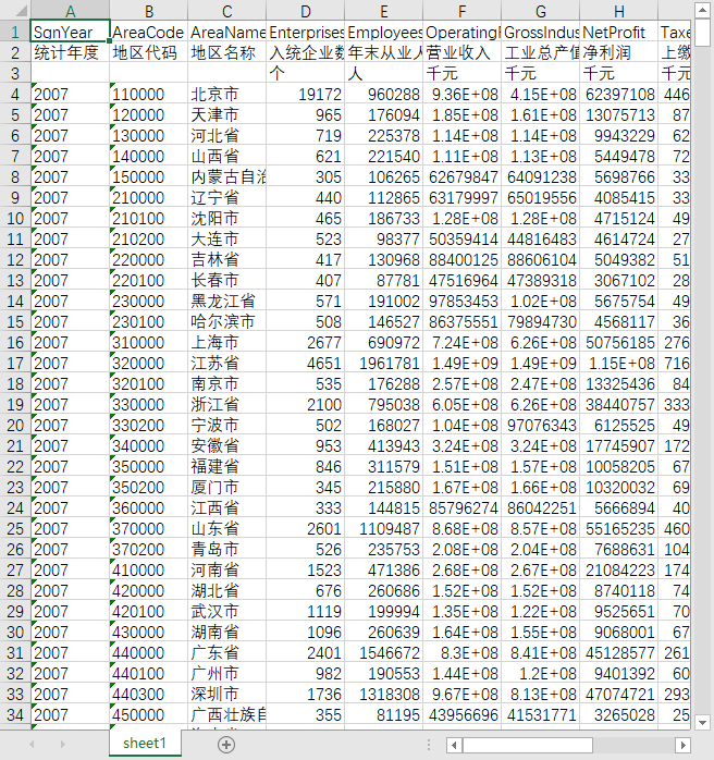 统计年度 地区代码 地区名称 入统企业数 年末从业人员数 营业收入 工业总产值 净利润 上缴税费 出口总额 出口创汇 年末资产 年末负债