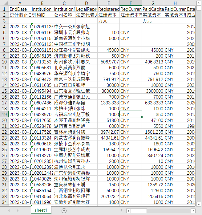 统计截止日期 机构ID 公司名称 法定代表人 注册资本 注册资本币种 实缴资本 实缴资本币种 成立日期 核准日期 营业期限起始日期 营业期限结束日期 经营状态 所属省份 所属城市 所属区县 公司类型 所属行业名称 所属行业代码 曾用名 统一社会信用代码 纳税人识别号 注册号 组织机构代码 参保人数 联系电话 地址 网址 邮箱 经营范围