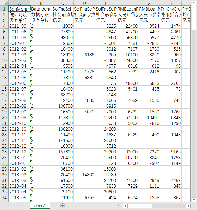 统计月度 数据标识 社会融资规模 社会融资规模同上月增减额 社会融资规模同去年同期增减额 人民币贷款增减额 人民币贷款同比增减额 外币折合人民币增减额 外币折合人民币同比增减额 委托贷款增减额 委托贷款同比增减额 信托贷款增减额 信托贷款同比增减额 未兑现银行承兑汇票增减额 未兑现银行承兑汇票同比增减额 企业债券净融资 企业债券净融资同比增减额 非金融企业境内股票融资 非金融企业境内股票融资同比增减额