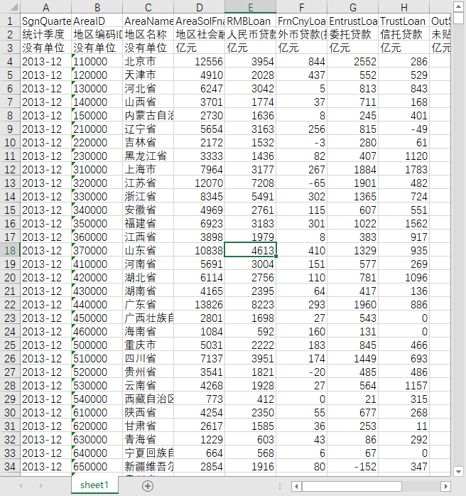 统计季度 地区编码ID 地区名称 地区社会融资规模 人民币贷款 外币贷款(折合人民币) 委托贷款 信托贷款 未贴现银行承兑汇票 企业债券 非金融企业境内股票融资