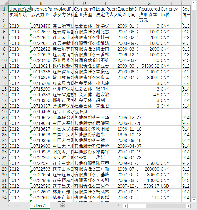 更新年度 涉及方ID 涉及方名称 企业类型 法定代表人 成立时间 注册资本 币种 统一社会信用代码 注册地址 所属国家 所属省份 所属城市 股票代码 上市交易所 经营范围 经营状态 人员规模 行业代码A 行业名称A 行业代码B 行业名称B 行业代码C 行业名称C 曾用名