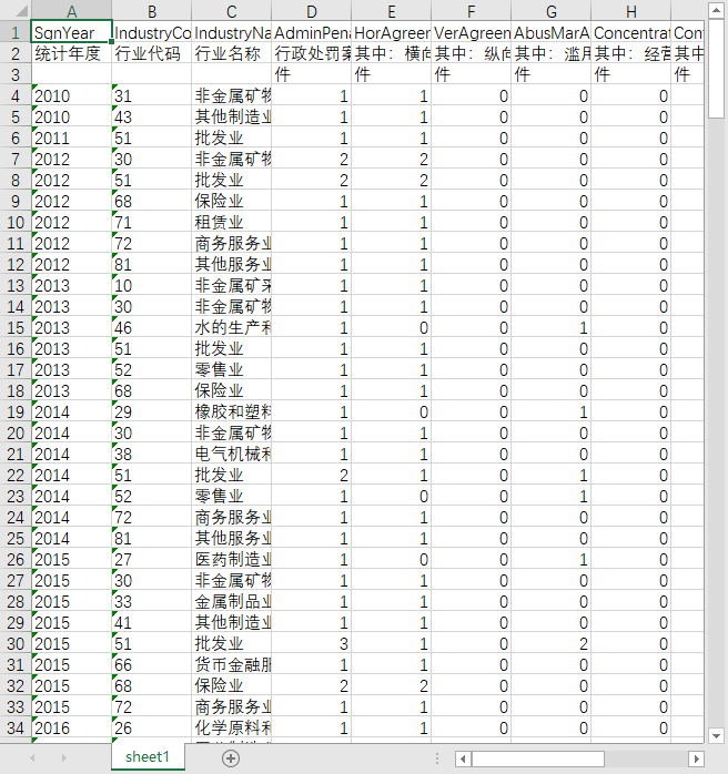 统计年度 行业代码 行业名称 行政处罚案件数 其中:横向垄断协议案件 其中:纵向垄断协议案件 其中:滥用市场支配地位案件 其中:经营者集中案件 其中:没收违法所得案件 行政处罚涉及企业数 其中:上市公司数 罚款总金额 没收违法所得