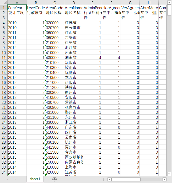 统计年度 行政层级 地区代码 地区名称 行政处罚案件数 其中:横向垄断协议案件 其中:纵向垄断协议案件 其中:滥用市场支配地位案件 其中:经营者集中案件 其中:没收违法所得案件 行政处罚涉及企业数 其中:上市公司数 罚款总金额 没收违法所得