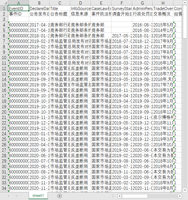 事件ID 公告发布日期 公告标题 信息来源 案件执法机构 调查开始日期 行政处罚日期 交易概况 经营者集中方式 被处罚方名称 被处罚方ID 其他方名称 其他方ID 违规年度 处罚措施编码 罚款金额 没收违法所得