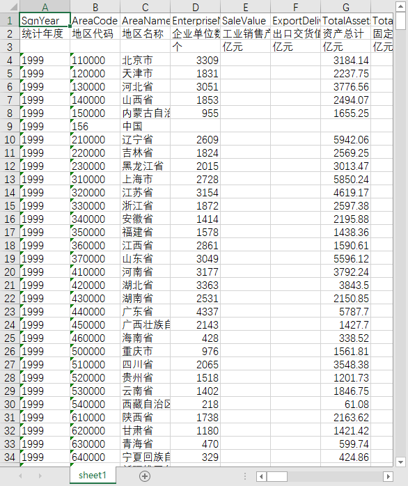 统计年度 地区代码 地区名称 企业单位数 工业销售产值 出口交货值 资产总计 固定资产合计 固定资产净额 固定资产原价 累计折旧 流动资产合计 应收账款 存货 存货-产成品 负债合计 流动负债合计 应付账款 所有者权益合计 实收资本 国家资本 集体资本 法人资本 个人资本 港澳台资本 外商资本 营业收入 营业成本 销售费用 管理费用 财务费用 利息收入 利息支出 投资收益 营业利润 利润总额 亏损企业亏损额 平均用工人数