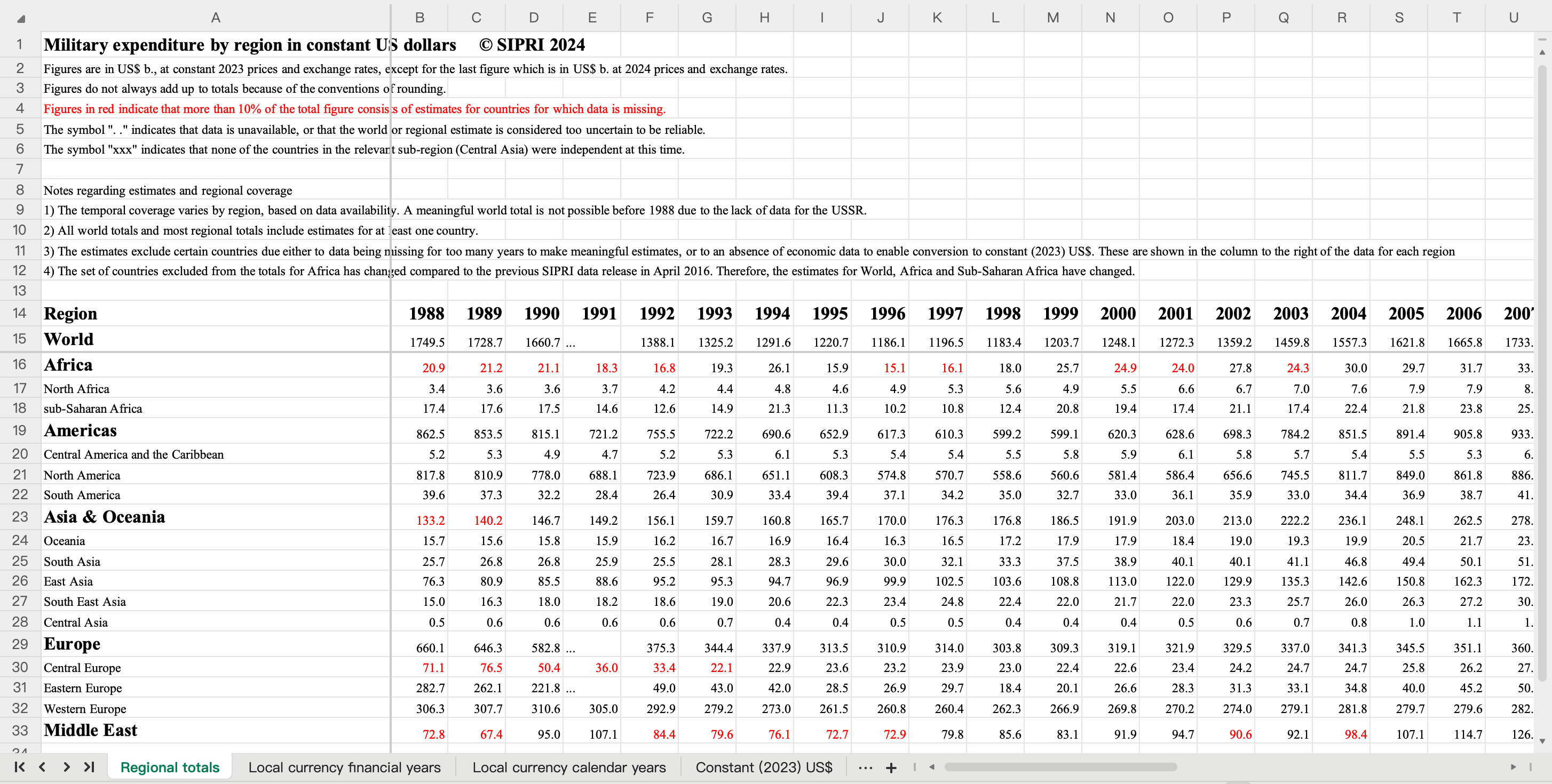 斯德哥尔摩国际研究院(SIPRI)发布的军事支出数据库提供从1949年至2024年的国家年度军费数据(地方币种/现价美元/常数美元等形式)数据包括:军队及文职人员薪酬、社会保障、运维、采购、军事研发、军事援助(在援助国账目中)等支出项目