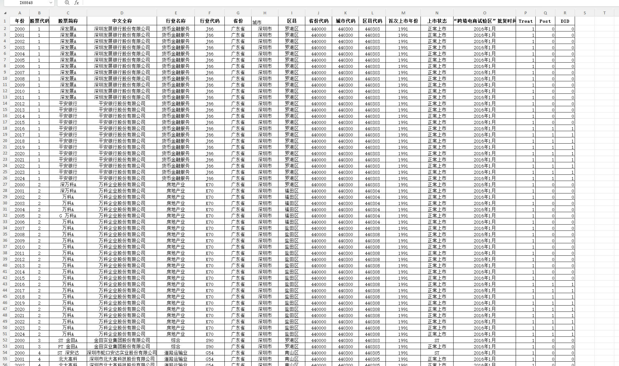 数据指标:年份、股票代码、股票简称、中文全称、行业名称、行业代码、省份、城市、区县、省份代码、城市代码、区县代码、首次上市年份、上市状态、"跨境电商试验区"批复时间、Treat、Post、DID