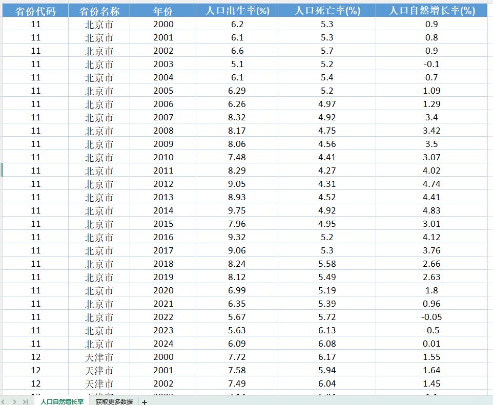 附件 331省份人口自然增长率人口出生率人口死亡率数据(2000-2024年)