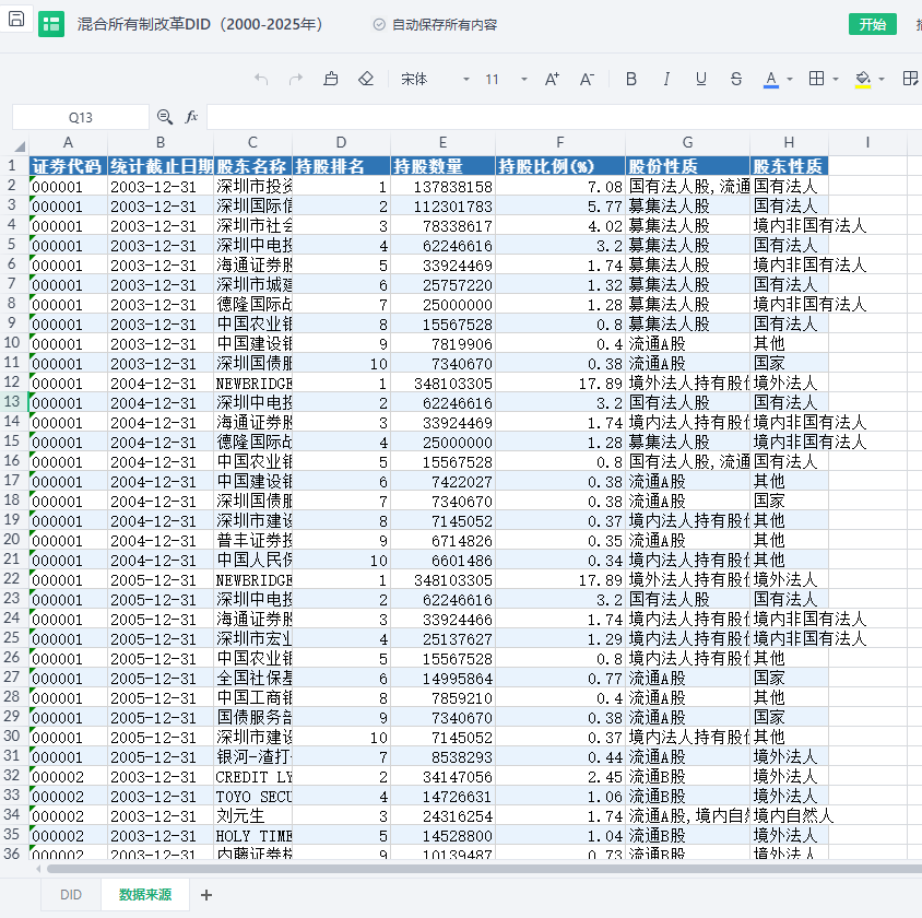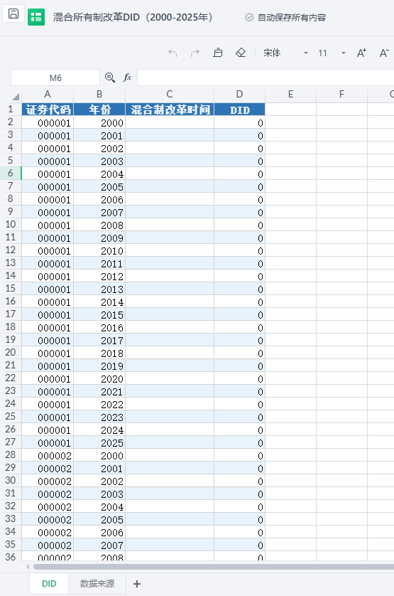本数据参考陈林等(2024)《混合所有制改革与绿色全要素生产率——基于工业污染源重点调查的经验证据》的研究,构建混合所有制改革DID变量,其具体步骤为:考虑到2003年国务院国有资产监督管理委员会成立,在国有企业改革、国有资本重组方面做出了重要调整,为了有效反映新环境下国有企业混合所有制改革的效应,以及权衡改革前后时间长度的因素,选取2003—2004年发生混合所有制改革的企业在当年及以后年份取值为1,否则为0.