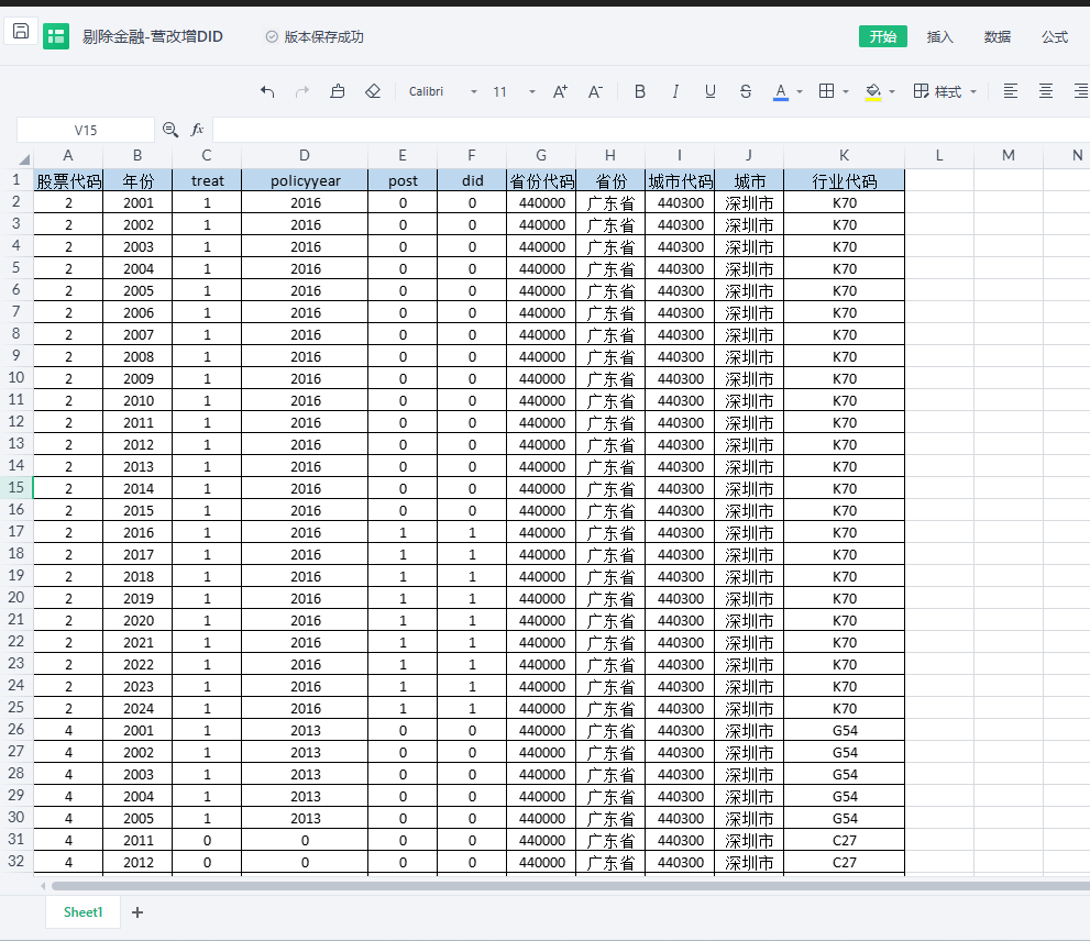 股票代码 年份 treat policyyear post did 省份代码 省份 城市代码 城市 行业代码