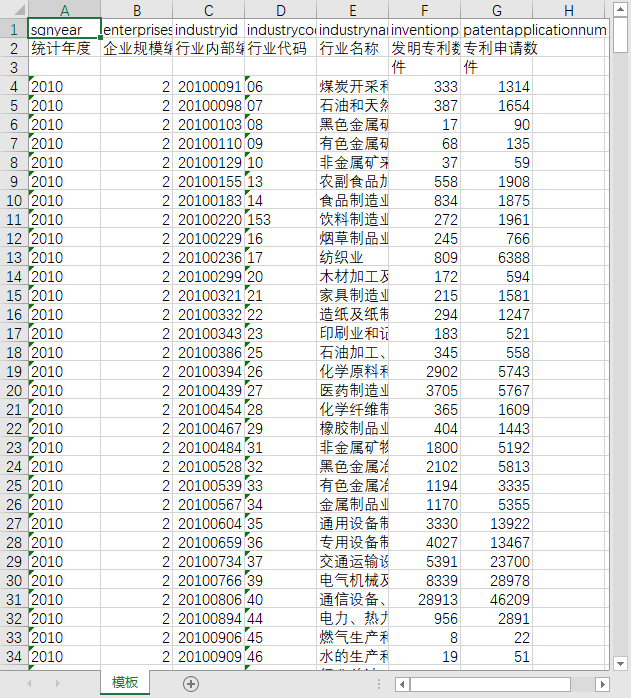 统计年度 企业规模编码 行业内部编码 行业代码 行业名称 发明专利数 专利申请数