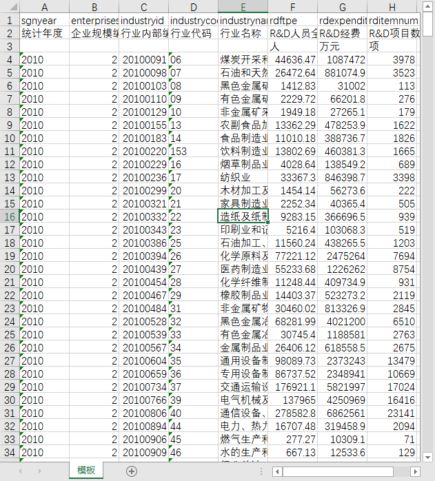 统计年度 企业规模编码 行业内部编码 行业代码 行业名称 R&D人员全时当量 R&D经费 R&D项目数