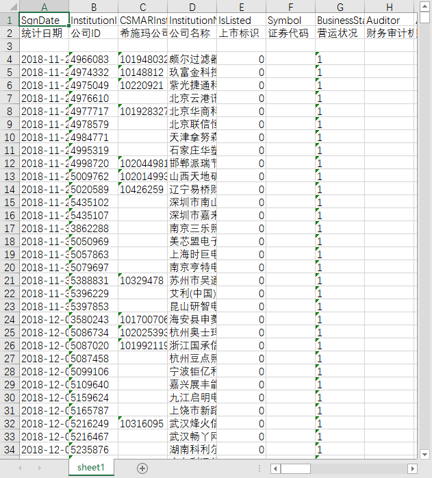 统计日期 公司ID 希施玛公司ID 公司名称 上市标识 证券代码 营运状况 财务审计机构 财务审计机构统计时间 成立日期 注册资本 注册资本币种 注册资本统计时间 员工人数 员工人数统计类型 员工人数统计时间 所属行业门类-主营业务 所属行业代码-主营业务 所属行业名称-主营业务 所属行业门类-其他业务 所属行业代码-其他业务 所属行业名称-其他业务 主要产品 经营范围 公司登记注册类型 注册地址 所属国家或地区名称 所属国家或地区代码 所属省份 所属省份代码 所属城市 所属城市代码 ISIN编码