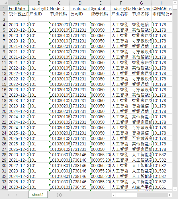 统计截止日期 产业ID 节点代码 公司ID 证券代码 产业名称 节点名称 希施玛公司ID 核心企业 整体的话语权 上游话语权 下游话语权 专利数 研发人员数量 研发人员数量占比 研发投入金额 研发投入占营业收入比例