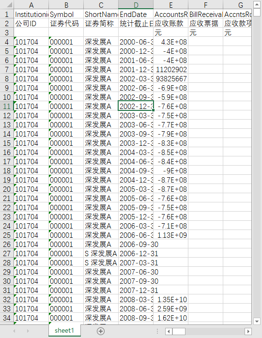 公司ID 证券代码 证券简称 统计截止日期 应收账款 应收票据 应收款项融资 预付款项 合同资产 长期应收款 资产总计 应付账款 应付票据 合同负债 预收款项 长期应付款 负债总计 主营业务收入 营业总收入 净利润 银行借款比例 短期借款依赖度 资产负债率 经营活动产生的现金流量净额/负债合计 筹资活动债权人现金净流量 筹资活动股东现金净流量 经营活动产生的净流量增长率 投资活动产生的现金流量增长率 筹资活动产生的现金流量增长率 可持续增长率 盈利波动性 Zscore Oscore