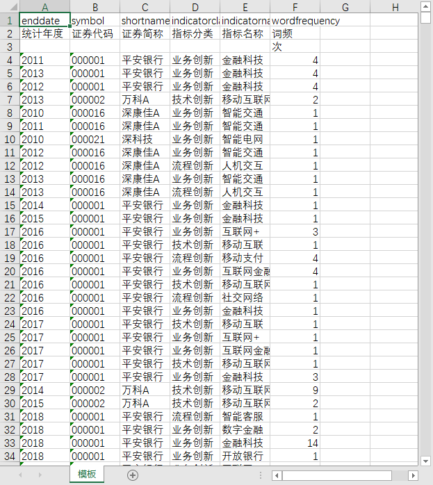 统计年度 证券代码 证券简称 指标分类 指标名称 词频