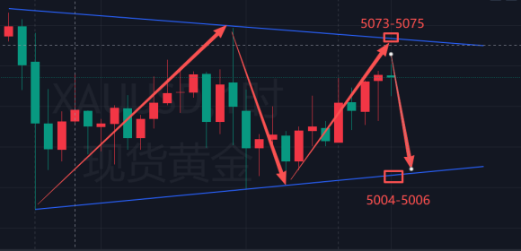 建议黄金回踩下方5004-5006分批多,止损4980,目标5050-5055;如果金价拉升到上方5073-5075这个位置,建议分批短空,止损5100,目标5020-5030;(策略建议仅供参考,盈亏自负,做单严格做好风控,设置止损和目标位置,杜绝扛单)