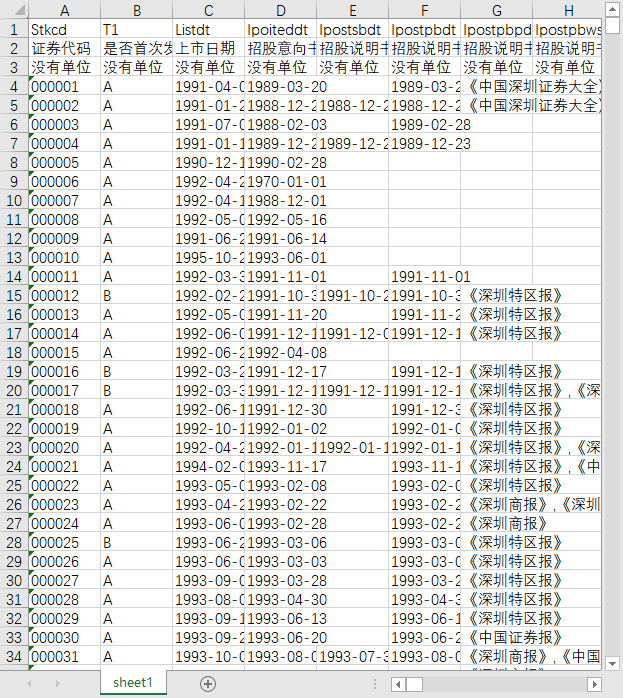 证券代码 是否首次发行 上市日期 招股意向书公告日期 招股说明书签署日期 招股说明书发表日期 招股说明书发表刊物 招股说明书发表网站 上市公告书发表日期 上市公告书发表刊物 上市公告书发表网站 招股开始日期 招股截至日期 网上申购开始日期 网上申购截止日期 网下申购开始日期 网下申购截止日期 二级市场配售日期 发行定价公告日期 其他发行日期 市值计算日 路演开始日期 路演截止日期 路演网站 主推荐人 第一副推荐人 第二副推荐人 每股面值 认购及交易币种 发行对象 发行方式 承销方式 发行定价办法 初步询价上限 初步询价下限 发行价格 发行前加权平均市盈率 发行前全面摊薄市盈率 发行前全面摊薄市盈率上限 发行前全面摊薄市盈率下限 发行后加权平均市盈率 发行后全面摊薄市盈率 发行前每股净资产 发行后每股净资产 发行前每股收益 发行后每股收益 发行市净率 超额配售选择权标志 招股数量 非公开发行股份数 公开招股数量 发行数量 实际非公开发行总股数 定向募集法人股 定向募集职工股 特别发行数量 实际公开发行总股数 本次上市流通股数 其中:国有股存量实际发行数量 其中:社会公众实际发行数量 其中:员工实际发行数量 其中:战略投资者实际配售数量 其中:基金实际配售数量 其中:保险公司实际配售数量 其中:一般法人实际配售数量 其中:承销商实际认购余额 其中:其他发行数量 向一般法人配售股份锁定期 向保险公司配售股份锁定期 向基金配售股份锁定期 向战略投资者配售股份锁定期 其他发行股份锁定期 上网发行中签率(%) 市值配售中签率(%) 网下有效申购配售比例(%) 被基金所持比率(%) 总有效申购股数 网下有效申购股数 网上有效申购股数 总有效申购户数 网下有效申购户数 网上有效申购户数 总超额认购倍数 网下累计超额认购倍数 网上累计超额认购倍数 持股户数 其中:持有1000股以上户数 预计募集资金总额 预计发行总费用 预计募集资金净额 实际募集资金总额 实际每股发行费用 实际募集资金净额 实际发行总费用 其中:总承销费用 其中:保荐费用 其中:注册会计师费用 其中:资产评估费用 其中:律师费用 其中:上网发行费用 其中:股票登记费 其中:审核费用 其中:信息披露费用 其中:其他费用 资产评估机构 资产评估机构经办人 土地评估机构 土地评估机构经办人 会计师事务所 会计师事务所经办人 发行人法律顾问 发行人法律顾问经办人 主承销商法律顾问 主承销商法律顾问经办人 上市保荐人 财务顾问审计机构 股票登记机构 公司的收款银行 公司的银行帐号 发行时所得税税率(%) 发行时所得税税率类型 初步询价公告日 初步询价起始日 初步询价截止日 网下定价日 网上路演公告日 发行公告日 网下配售结果公告日 网上申购资金验资日 网下申购资金验资日 网下发行缴款日 发行结果公告日 募集资金到帐日期 募集资金到帐金额 股利分配政策 网上申购资金解冻日 网下申购资金退款日 网上申购冻结资金 网下申购冻结资金 二级市场配售缴款截止日 新股配售经纪佣金费率 首发时所属行业市盈率 初步询价投资者家数 初步询价询价对象家数 初步询价申购总量 初步询价申购倍数